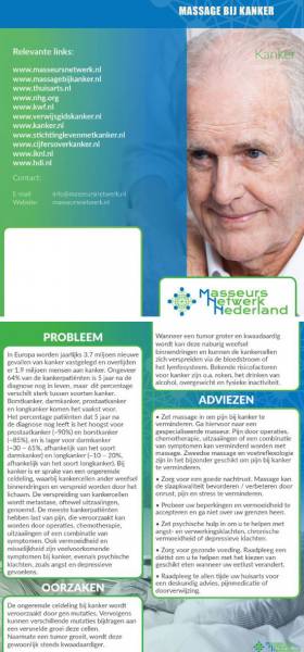 Cliëntenfolder “Massage bij kanker” – 25 stuks full colour Extra voordelig voor basic en premium leden van Masseurs Netwerk Nederland Ook voor niet leden van Masseurs Netwerk Nederland Informeer je klanten over het nut van de inzet van massage bij kank …
