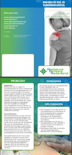Cliëntenfolder “Massage bij Nek- en schouderklachten” – 25 stuks full colour Extra voordelig voor basic en premium leden van Masseurs Netwerk Nederland Ook voor niet leden van Masseurs Netwerk Nederland Informeer je klanten over het nut van de inzet va …