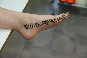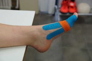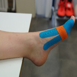 Na 3 weken en enkele tapings later, zijn de klachten vrijwel verdwenen. Hij wil nu aan een meerdaagse wandeltocht gaan deelnemen. Nu kiest u voor de Kinesio- of Dynamic tape (zie foto 4 en 5), omdat de mechanische ondersteuning minder nodig is en deze tapings langer op de voet kunnen blijven zitten. Deze keuze voor een elastische taping is goed, omdat verbetering van de propriocepsis en de aansturing van het gewricht nu voorop staan.