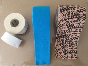 Van links naar rechts: Wit sporttape, blauw Kinesiotape en Dynamic tape (Tattoo print).