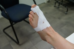 Deze aandoening wordt ‘zandteen’ genoemd, een bekende blessure in de sportwereld. Dit betekent, dat de bandjes rondom het MTP1-gewricht aangedaan zijn. Dit herstelt vanzelf met de nodige rust. Aangezien Teun toch graag wil voetballen stelt u voor nu direct een taping aan te leggen met sporttape, wat het gewricht (mechanisch) ondersteunt (zie foto 3).